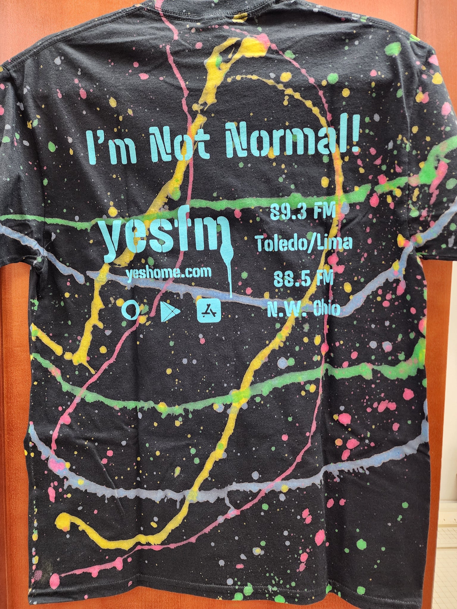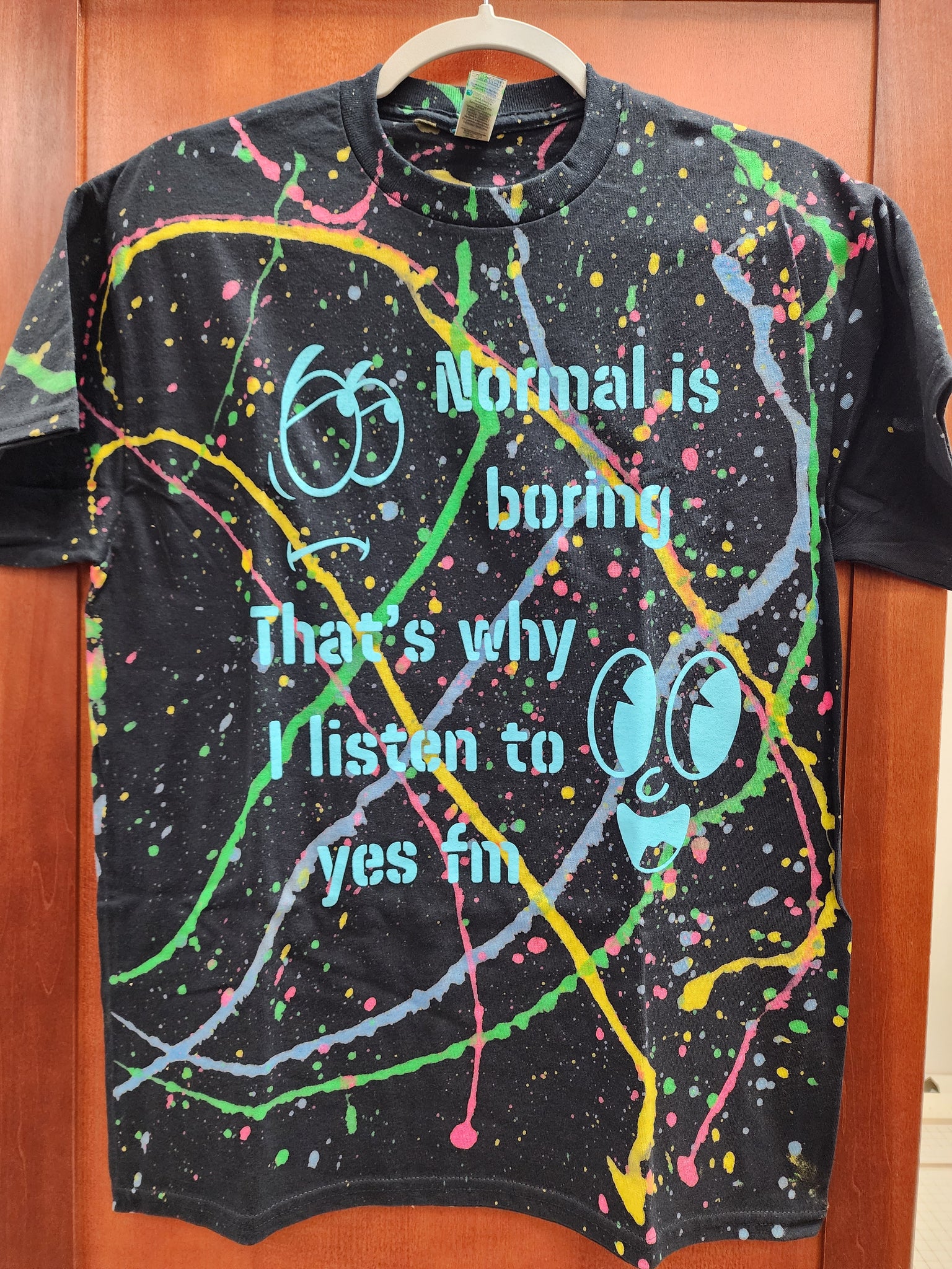 YES FM's Normal is Boring shirt! Each shirt is unique with the color splatters are different on each one. "Normal is boring, That's why I listen to YES FM" on the front, "I'm not normal" on the back. Gildan heavy cotton tee, unisex sizes.